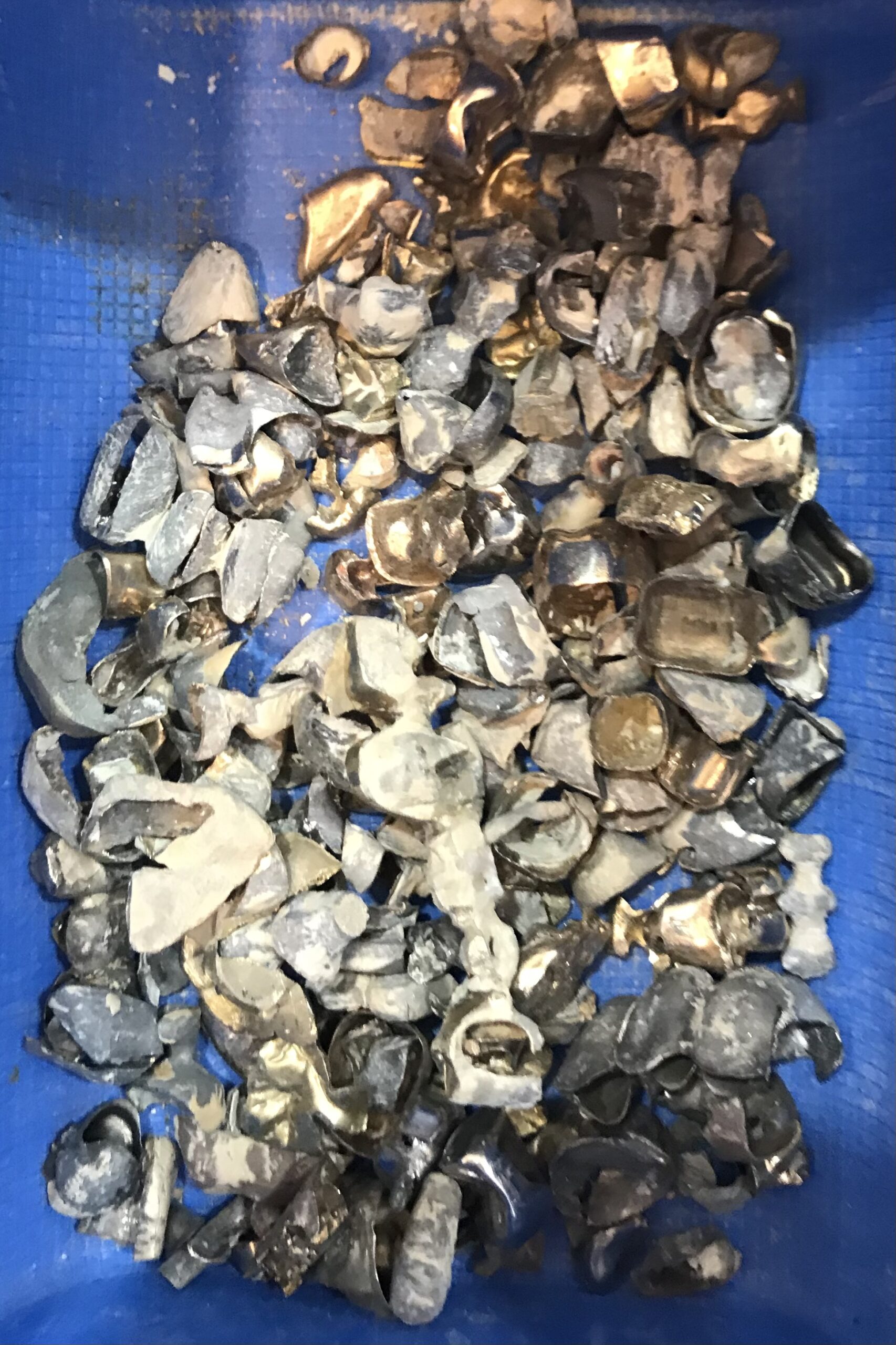 Das ermittelte Gewicht des gereinigten Zahngoldes ist zusammen mit dem festgestellten Goldgehalt Grundlage für die Bewertung. Oft wirkt Zahngold nicht „goldfarben“, sondern eher grau oder silbrig. Lassen Sie sich davon bitte nicht täuschen. Bedingt durch die jeweilige Legierung kommt es natürlich entsprechend zu unterschiedlichen Färbungen beim Zahngold. In seltenen Fällen besteht Zahngold aus Palladium, einem Edelmetall, welches auch einen hohen Marktwert hat. Auch hier ist der offizielle Ankaufs-Handelspreis für die Bewertung maßgeblich.